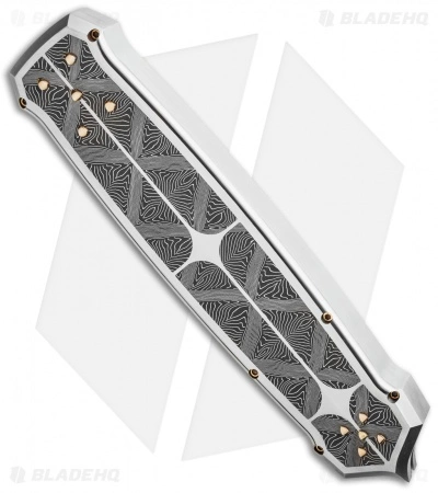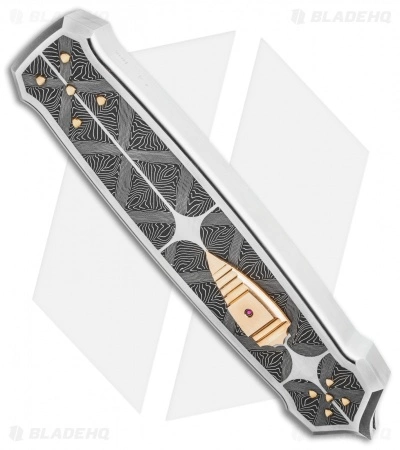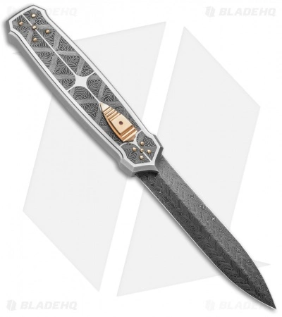 This one-of-a-kind custom “Price” Dagger features a 416 stainless steel frame with Ponzio mosaic Damascus inlays and 24k gold plated badges and firing button with a 2mm ruby. Marked on the side of the handle with “#4 HHK.” The double-edge blade is Ponzio “Turkish Twist” Damascus steel. Included with this spectacular knife is a signed certificate of authenticity and warranty. From maker, July 2015.