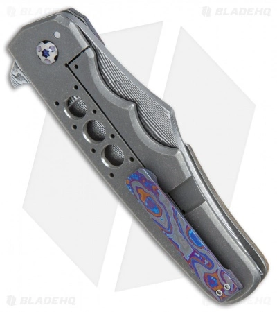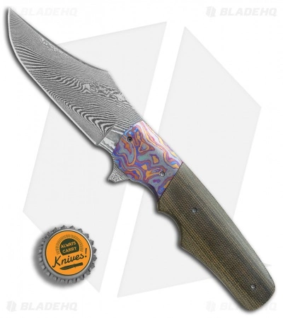 This Clip Point flipper from Jason Clark features a titanium frame lock handle with a green micarta top scale and Timascus bolster. It has a large clip point blade made from damascus steel. It’s a great look that belongs in your collection. The blade glides open with ease on an IKBS ball-bearing pivot. The handle’s backside is tumbled titanium with frame lock. Rounding out the package is the satin finished steel back spacer and a flat Timascus pocket clip.
