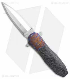 Jason Clark makes a number of impressive flippers and this Dagger knife adds to the list. It has a symmetric build from handle to tip. The Takefu San Mai dagger blade is double-edged and sharpened, so be careful. It has a silver lightning strike carbon fiber scale paired with a Timascus bolster and a bronze anodized titanium frame lock. Action is smooth with IKBS ball-bearings. Fitted with a milled Timascus pocket clip.