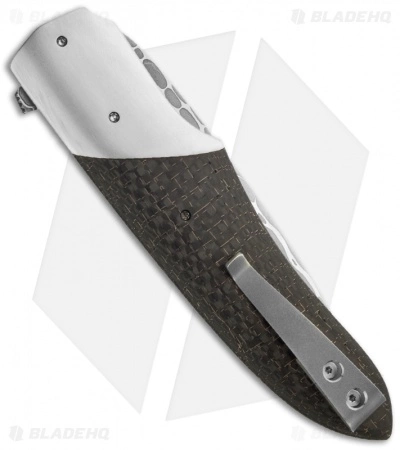This Jason Clark Hybrid Drop Point Flipper features a Chad Nichols “Lizard” pattern Damascus steel blade; hollow ground with swedge spine. The handle has a titanium liner lock frame with bolsters, contoured lightning strike carbon fiber scales and fileworked stainless steel back spacer. The blade opens with ease thanks to the IKBS bearing system and flipper guard. This Jason Clark folder is a beautiful knife that is collection and everyday ready.