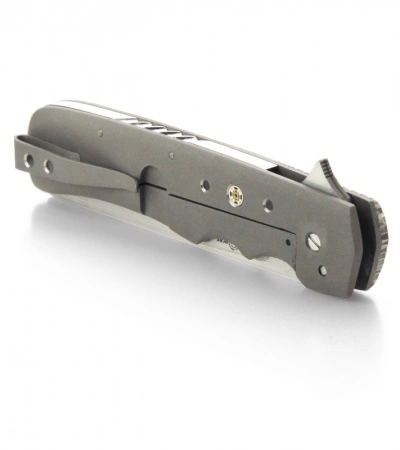 This Razor Flipper knife from Jason Clark features a polished C-Tek bolster and stabilized brown Mallee burl scale. The handle has a titanium framelock, liner and pocket clip. The backspacer is satin finished stainless steel with filework. The hollow ground blade is VG-10 San Mai steel. IKBS bearing system for smooth action.
