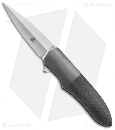 This knife is a smaller model with all the refinement of Jason Clark’s full-size models including an IKBS ball-bearing pivot, frame lock, pocket clip, and flipper actuated blade. This model has a lightning strike carbon fiber scale and zirconium bolster. The blade has a partially sharpened upper edge.