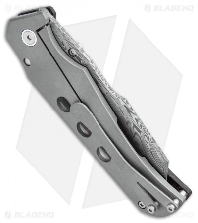 This Jason Guthrie Custom Scout model features a coppershred carbon fiber handle with a skeletonized titanium frame and a “Thor” Damasteel wharncliffe blade. Item has satin hardware and a titanium pocket clip.