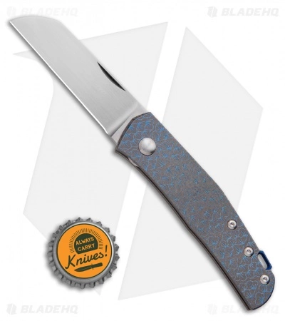Jens Anso’s EDC modern traditional skills are on full display in this Custom Monte Carlo folding knife. This model is outfitted with a blue engraved titanium handle and an RWL-34 steel sheepsfoot blade. The blade opens with a nail nick and employs a slip joint with a full half stop. A blue anodized titanium 3D machined pocket and backspacer complete the custom design.