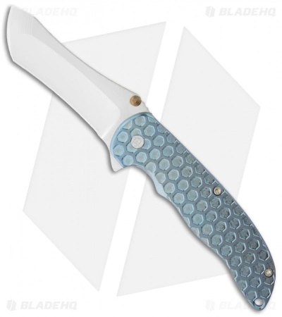 The Norseman is an excellent flipper and it’s also John Grimsmo’s first knife design! It features a blue anodized honeycomb textured titanium handle front and framelock back with pocket clip. The RWL steel blade has a great look and features CNC machined grinds. The action on this flipper is superb; nice detent for smooth, effortless deployment with ball bearing pivot.