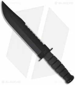 The Big Brother from Ka-Bar features their famous oval shaped handle with Kraton instead of leather. The blade is black coated 1095 Cro-Van steel with a plain cutting edge and serrated upper edge. This knife comes with a leather sheath.