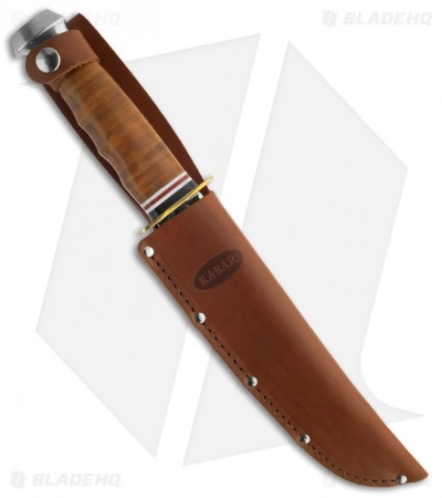 The 1236 Ka-Bar is a classically styled hunting fixed blade knife that has been popular since the early 1900’s. It features a polished stainless steel Bowie blade with hollow grinds. The brass guards and stacked leather handle are complemented by colored spacers and an aluminum pommel. Includes a brown leather KA-BAR sheath.