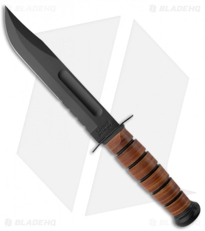 The full-size USMC Ka-Bar, the most famous fixed blade knife in the World, gets updated with a serrated edge to better cut synthetic and looped materials. Features Ka-Bar’s famous oval shaped leather handles. This is the same knife design used by the armed forces in World War II. The blade is black coated 1095 Cro-Van steel with partial serrations. This knife comes with a leather sheath.