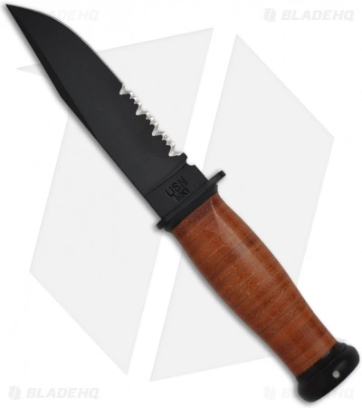This Ka-Bar Mark I is a replica of the USN MK 1 fixed blade knife from WWII. It has a 1095 Cro-Van steel blade with a black finish and partially serrated edge. The leather handle is ergonomically shaped for stellar grip. This knife comes with a leather sheath for belt carry.