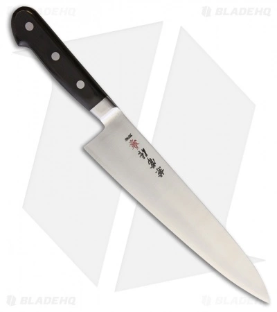 The 8.375″ satin finished blade has a core of Aogami Blue Steek clad with 410 stainless steel for corrosion resistance. A slight curve is present in the blade, making chopping, mincing and dicing quick and easy. The handle is mated to the full tang blade with a polished stainless steel bolster. Attractive black wood handles feature glued and pinned construction for a reliable and durable tool. Comfortable in hand, the contoured handle allows you to safely and precisely control the cutting edge with little to no fatigue.