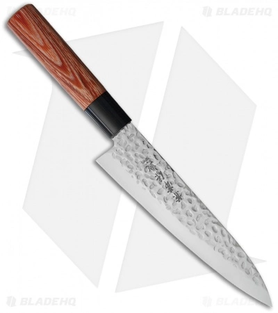 The Gyutou Chef’s knife by Kanetsune features a 7″ blade made of hammered stainless steel DSR-1K6 for an attractive and durable finish. DSR-1K6 takes an excellent edge, and easy to maintain, all the qualities you need in a functional kitchen knife. Attractive wood handles are pinned to the full tang blade and allow you to handle the knife right at the cutting edge in safety.
