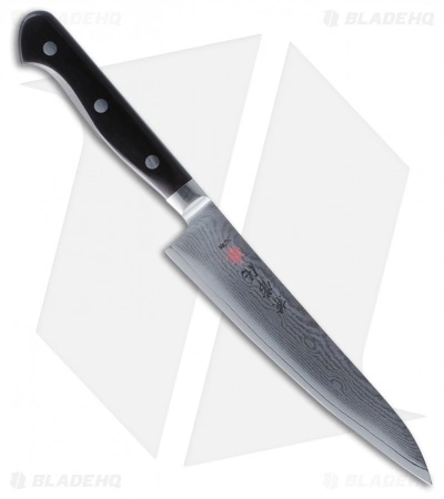 The Kanetsune Large Petty Chef’s knife is a must have for any kitchen. Featuring a 6.125″ Damascus steel blade with a VG-10 stainless steel core, the Large Petty makes your cutting tasks a breeze. Comfortable contoured black wood handles provide an excellent grip on the knife. The polish stainless steel bolster is an attractive accent to the dark handle and Damascus blade.