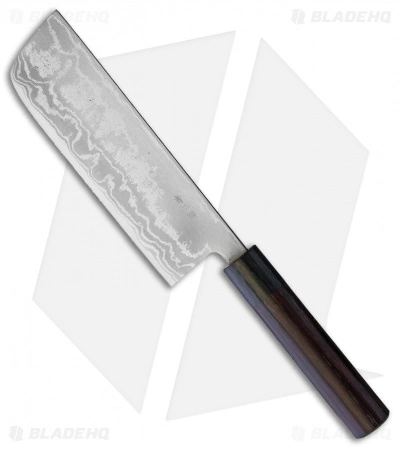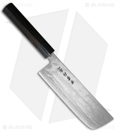 The Nakiri from Kanetsune knives features a San Mai Constructed blade with Japanese Blue Steel core, sandwiched between two pieces of Japanese Damascus steel shells, and features a comfortable plywood handle.