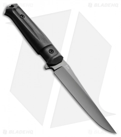 The long slender blade of the Kizlyar Supreme Croc fixed blade knife is perfect for close quarters combat. Made of D2 tool steel and hardened to 60-63 RC, you can expect excellent toughness and edge retention. The addition of a small but functional finger guard adds extra safety. A comfortable black Kraton handle allows for a variety of hand positions. Included is a MOLLE compatible black nylon sheath with locking mechanism. This one has a black finished blade.