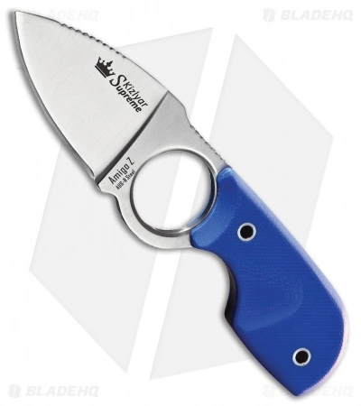 This Amigo model is outfitted with a AUS-8 stainless steel blade with a satin finish. The Amigo Z was designed from the ground up to be a class leading neck knife. It has just about everything you’re looking for in a small everyday fixed blade, including consideration for safety, size and weight, ease of extraction, premium materials, and uncompromising utility. This Amigo Z has a full-tang blade with lightly textured blue G-10 scales. The index finger ring ensures a reliably grip in all conditions. An exciting element of the Amigo is the sturdy, yet lightweight G-10 sheath.