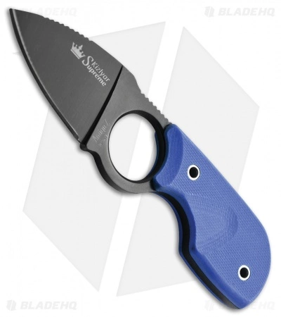 This Amigo model is outfitted with a D2 steel blade with a black TiNi finish. The Amigo Z was designed from the ground up to be a class leading neck knife. It has just about everything you’re looking for in a small everyday fixed blade, including consideration for safety, size and weight, ease of extraction, premium materials, and uncompromising utility. This Amigo Z has a full-tang blade with lightly textured blue G-10 scales. The index finger ring ensures a reliably grip in all conditions. An exciting element of the Amigo is the sturdy, yet lightweight G-10 sheath.