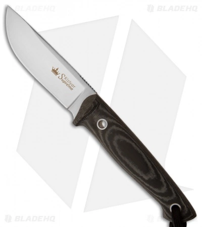 This knife has a satin-finished blade and black micarta handle.