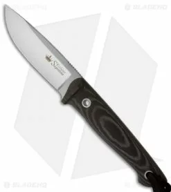 The Santi fixed blade is a compact, tough knife for a wide variety of tasks. It features a drop point profile. The design is full-tang with Micarta scales that are attached using stainless steel tube fasteners and a glue underneath. The handle has small bump guards and fits securely in hand.