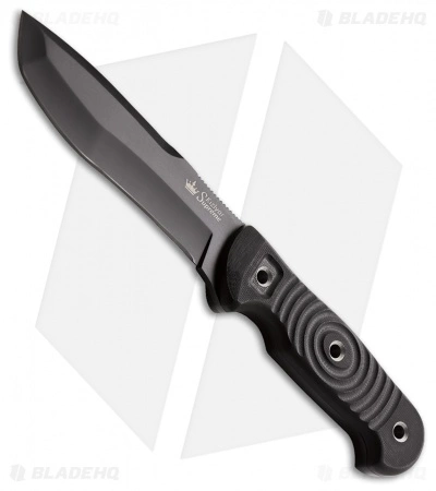 The modified tanto blade shape features a slight recurve for powerful pull cuts, strong tip for excellent piercing and a sharpened swedge. Grooved black G-10 handles provide fantastic traction for confidence in hand. A black nylon MOLLE compatible sheath for easy carry in the field.