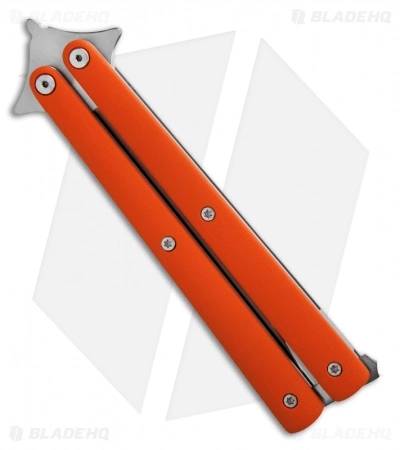 The Model 1 Bali is one of our favorite butterfly knives. It has incredibly smooth action, precision build, and a clean design. This knife features smooth orange G-10 scales over titanium liners. The clip point blade is satin finished XHP steel with a plain edge. This Model 1 is outfitted with GTC bearings.