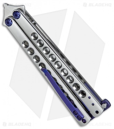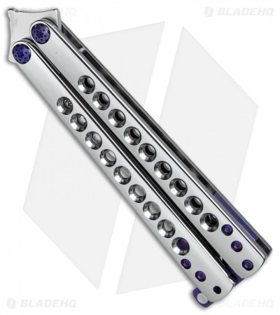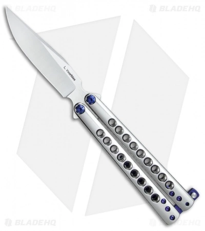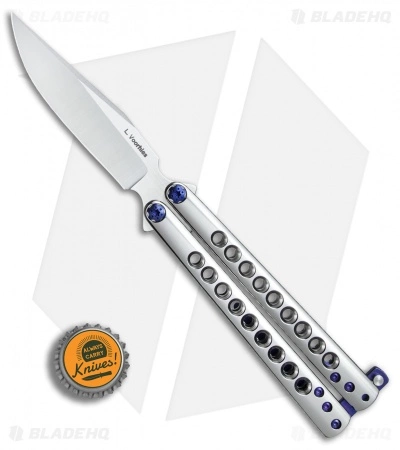 This Les Voorhies custom Model 2 balisong features skeletonized titanium handles with in a brilliant polished finish. Its clip point blade is made from CPM-S35VN stainless steel with a satin finish and a hollow grind. IKBS bearing pivots provide superb flipping action that is second to none. The knife comes outfitted with blue anodized titanium hardware, spacers, latch, and pocket clip.