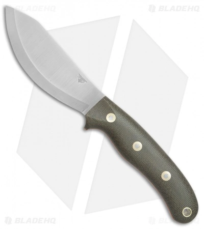 This Jessmuk model has a green micarta handle with orange liners and a CPM-3V blade with a scandi grind.