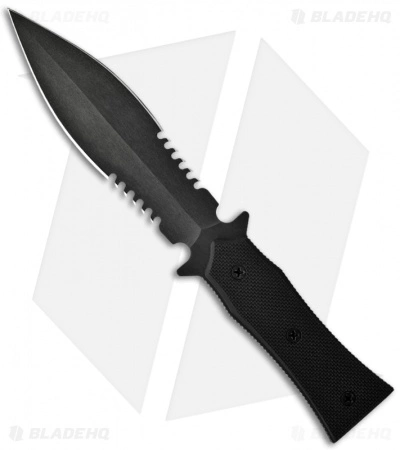 - Black-finished, double-edged dagger blade with wicked serrations made from D2 steel.