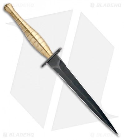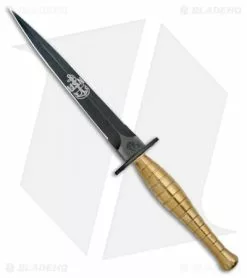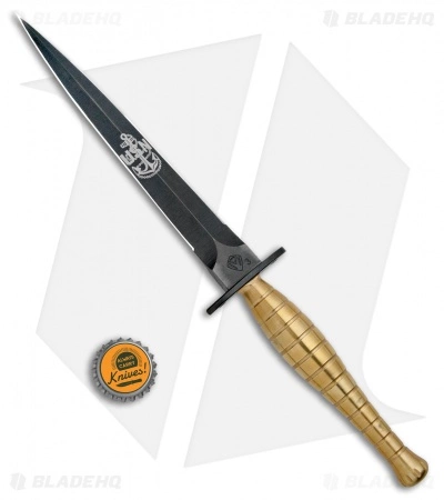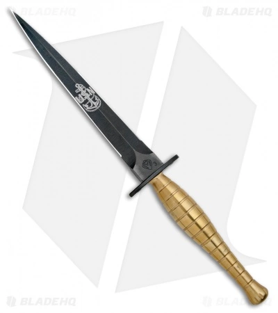 This FS Commando Dagger fixed blade has a brass handle and a black PVD coated blade with a USN SEALS laser engraving.
