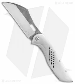 The Merriken Knives Mavik is a beefy folding knife with a large wharncliffe blade and an orange peel textured titanium frame lock handle. Its blade sports acid stonewashed flats and satin grinds, an elongated thumb hole, and a long section of jimping on the thumb ramp. The handle is equipped with standoff construction and a custom zirconium pocket clip.