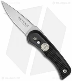 This Meyerco automatic knife is a Blackie Collins design. It has strong action and rock solid lockup. The glass filled nylon (GFN) handle is lightweight and textured for excellent grip characteristics. The drop point style blade is satin finished 154-CM stainless steel blade with a plain cutting edge. This is an excellent knife that doesn’t disappoint!