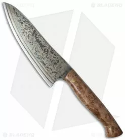 This Santoku knife is a gem with its Hitachi Blue Steel blade that bears a natural and exquisite patina. The spine of the blade is crowned and the handle is outfitted with maple burl wood scales. A beautiful wenge wood saya is included with this knife.