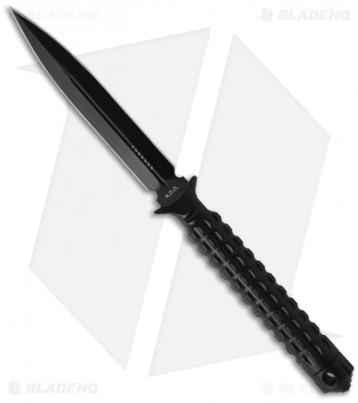 The A.D.O. (Alpha Detachment Operative) is an extraordinary fixed blade knife from Microtech. This ADO features a black finished double-edge dagger blade (plain) and handle with a waffle-style texture. This knife follows the design of Chris Reeve fixed blades with a hollow handle, accessed by unscrewing the glass breaker tip. It is made from a solid billet of stainless steel. The A.D.O. includes a composite sheath with a spring loaded tab to secure knife and a 2″ steel clip for belt carry.