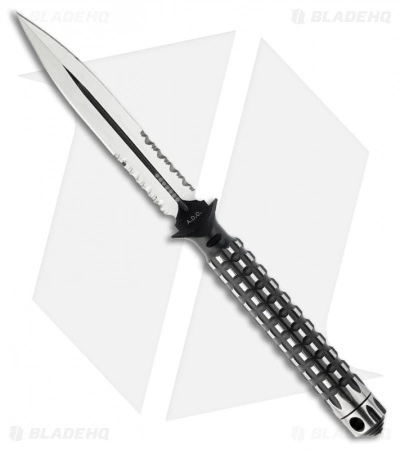 The A.D.O. (Alpha Detachment Operative) is an extraordinary fixed blade knife from Microtech. This Limited Edition ADO features a reverse two-tone (satin/black) finished double edge dagger blade (partially serrated) and handle with a waffle-style texture. This knife follows the design of Chris Reeve fixed blades with a hollow handle, accessed by unscrewing the glass breaker tip. It is made from a solid billet of stainless steel. The A.D.O. includes a composite sheath with a spring loaded tab to secure knife and a 2″ steel clip for belt carry.
