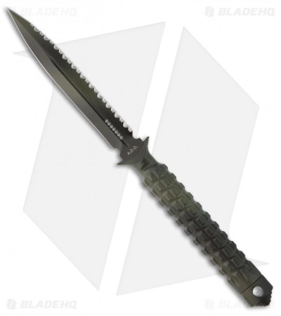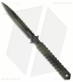 The A.D.O. (Alpha Detachment Operative) is an extraordinary fixed blade knife from Microtech. This ADO features a green camo finished double-edge dagger blade and handle with a waffle-style texture. The blade is fully serrated on one edge and plain on the other. This knife follows the design of Chris Reeve fixed blades with a hollow handle, accessed by unscrewing the glass breaker tip. It is made from a solid billet of stainless steel. The A.D.O. includes a composite sheath with a spring loaded tab to secure knife and a 2″ steel clip for belt carry.