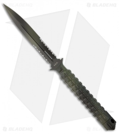 The A.D.O. (Alpha Detachment Operative) is an extraordinary fixed blade knife from Microtech. This ADO features a green camo finished double-edge dagger blade (part serrated) and handle with a waffle-style texture. This knife follows the design of Chris Reeve fixed blades with a hollow handle, accessed by unscrewing the glass breaker tip. It is made from a solid billet of stainless steel. The A.D.O. includes a composite sheath with a spring loaded tab to secure knife and a 2″ steel clip for belt carry.