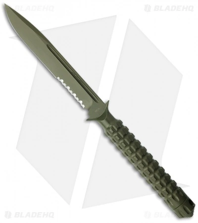 The A.D.O. (Alpha Detachment Operative) is an extraordinary fixed blade knife from Microtech. This ADO features a green finished single edge blade (partially serrated) and handle with a waffle-style texture. This knife follows the design of Chris Reeve fixed blades with a hollow handle, accessed by unscrewing the glass breaker tip. It is made from a solid billet of stainless steel. The A.D.O. includes a composite sheath with a spring loaded tab to secure knife and a 2″ steel clip for belt carry.