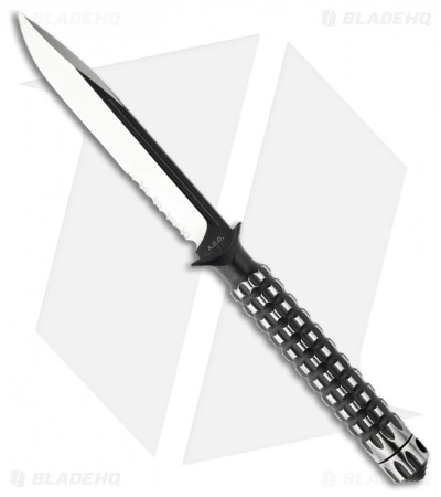 The A.D.O. (Alpha Detachment Operative) is an extraordinary fixed blade knife from Microtech. This Limited Edition ADO features a two-tone (satin/black) finished drop point blade (partially serrated) and handle with a waffle-style texture. This knife follows the design of Chris Reeve fixed blades with a hollow handle, accessed by unscrewing the glass breaker tip. It is made from a solid billet of stainless steel. The A.D.O. includes a composite sheath with a spring loaded tab to secure knife and a 2″ steel clip for belt carry.