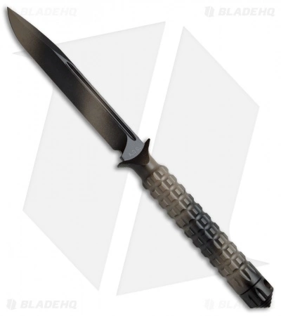 The A.D.O. (Alpha Detachment Operative) is an extraordinary fixed blade knife from Microtech. This ADO features a tan camo finished single edge blade (plain) and handle with a waffle-style texture. This knife follows the design of Chris Reeve fixed blades with a hollow handle, accessed by unscrewing the glass breaker tip. It is made from a solid billet of stainless steel. The A.D.O. includes a composite sheath with a spring loaded tab to secure knife and a 2″ steel clip for belt carry.