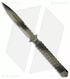 The A.D.O. (Alpha Detachment Operative) is an extraordinary fixed blade knife from Microtech. This ADO features a stealth camo finished double-edge dagger blade (part serrated) and handle with a waffle-style texture. This knife follows the design of Chris Reeve fixed blades with a hollow handle, accessed by unscrewing the glass breaker tip. It is made from a solid billet of stainless steel. The A.D.O. includes a composite sheath with a spring loaded tab to secure knife and a 2″ steel clip for belt carry.