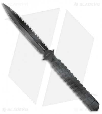 The A.D.O. (Alpha Detachment Operative) is an extraordinary fixed blade knife from Microtech. This ADO features an urban camo finished double-edge dagger blade and handle with a waffle-style texture. The blade is fully serrated on one edge and plain on the other. This knife follows the design of Chris Reeve fixed blades with a hollow handle, accessed by unscrewing the glass breaker tip. It is made from a solid billet of stainless steel. The A.D.O. includes a composite sheath with a spring loaded tab to secure knife and a 2″ steel clip for belt carry.