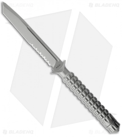 The A.D.O. (Alpha Detachment Operative) is an extraordinary fixed blade knife from Microtech. This ADO features a bead blast finished tanto blade (partially serrated) with a partly sharpened swedge spine (less than 1/4″ at the tip). The handle with a waffle-style texture and features a Chris Reeve style hollow handle, accessed by unscrewing the glass breaker tip. It is made from a solid billet of stainless steel. The A.D.O. includes a composite sheath with a spring loaded tab to secure knife and a 2″ steel clip for belt carry.