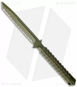The A.D.O. (Alpha Detachment Operative) is an extraordinary fixed blade knife from Microtech. This ADO features a green finished tanto blade (fully serrated) with a partly sharpened swedge spine (less than 1/4″ at the tip). The handle with a waffle-style texture and features a Chris Reeve style hollow handle, accessed by unscrewing the glass breaker tip. It is made from a solid billet of stainless steel. The A.D.O. includes a composite sheath with a spring loaded tab to secure knife and a 2″ steel clip for belt carry.