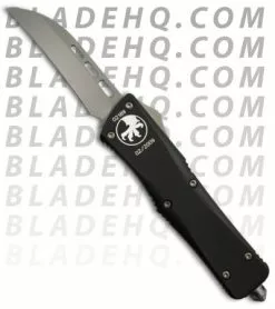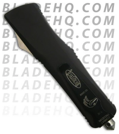 Microtech’s largest OTF production knife is named after the Troodon dinosaur. The Combat Troodon is the larger (really large!) version of the popular Troodon. Despite the size the handle feels slim and comfortable. The single edged tanto style blade is both attractive and functional and the action is Microtech excellent. Wharncliffe style bead blast finished blade (plain). T-6 black anodized handle. Tungsten glass breaker. Pocket clip.