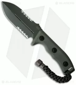 The Microtech Crosshair fixed blade knife in green is tried and true; this knife will hold up to the most adverse conditions. The blade is full tang and double-edged with partial serrations. The handle has composite scales and a braided lanyard with a stainless steel “knocker” bead. Includes a heavy duty Kydex sheath with locks.