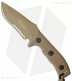 Microtech’s Currahee knife is built like a tank. It has a full-tang Elmax steel drop point blade with a partially serrated edge and tan finish. The coyote composite polymer handle is outfitted with a lanyard and knocker bead. Includes heavy duty sheath with MOLLE locks.