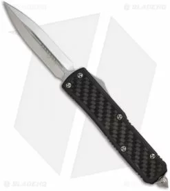 The Microtech Daytona is an impressive double action out-the-front automatic knife! This Daytona has a stonewash finished double edge dagger blade, made from premium S35-VN steel with plain edges. The handle is black anodized aluminum with polished carbon fiber inserts on front and back. The sturdy pocket clip has the serial number and Microtech logo. Includes glass breaker.