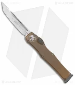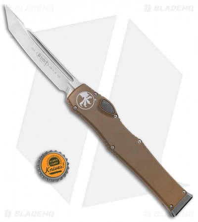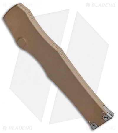 This The Halo VI has a tanto blade with a satin finish. Its handle is made from tan anodized aluminum with bead blasted hardware. The charging handle comes marked with the Microtech logo and date of creation.