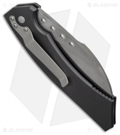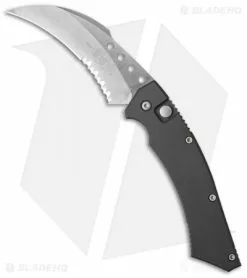 The Microtech Hawk has a stonewashed 14-4CrMo stainless steel blade with a partially serrated edge. The anodized aluminum handle has bead blast finished hardware and tip-down carry pocket clip.
