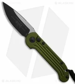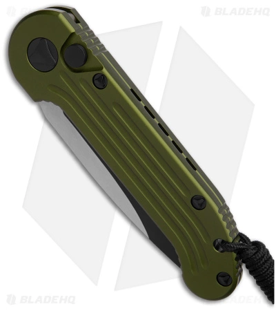 This model has a plain edge, black finished Elmax steel blade and OD green anodized handle with tactical black hardware.