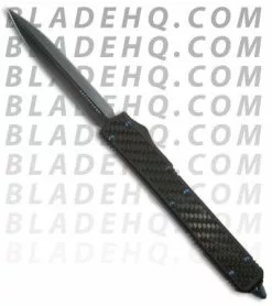 The Microtech Makora II knives fires in and out automatically via the sliding firing button the the knife’s right side. The handle is black anodized T-6 aluminum. The double edge blade is S30V and features a black diamond satin finish, meaning the black blade has some of the same luster and reflectiveness of the standard satin finish even though it’s black. The Makora II has pocket clip & black nylon sheath for easy carry. The clip also features a glass breaker on the end. The action on this run feels exceptional and we think the Makora series represents the Microtech line well. This model features all blued titanium hardware, giving it a sleek custom look, but it maintains a production price.